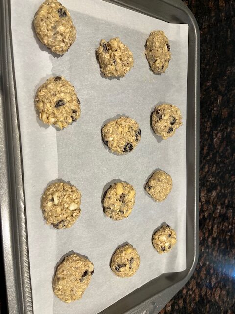 Using a spoon, I drop dollops of dough onto the prepared baking sheets, making sure to space them about 2 inches apart.