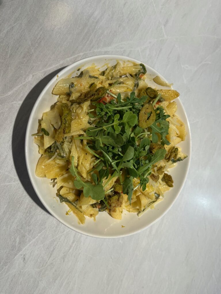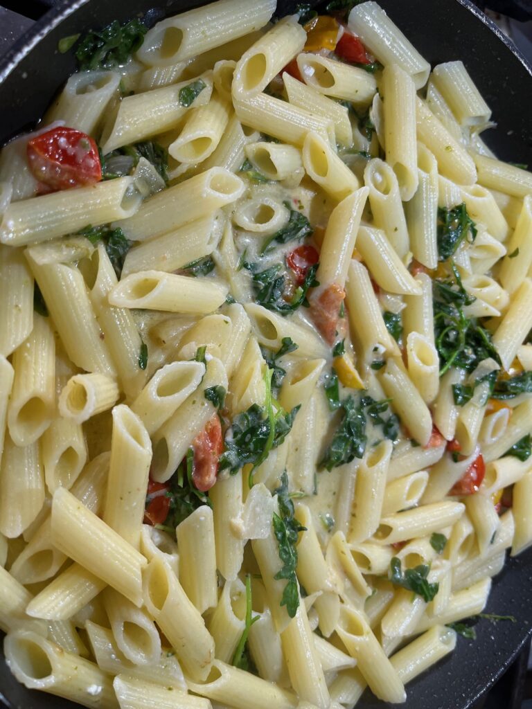 - Combine Pasta and Arugula: Add the cooked penne pasta to the skillet with the tomatoes. Toss to combine. Add the arugula and cook for another 1-2 minutes until it wilts.