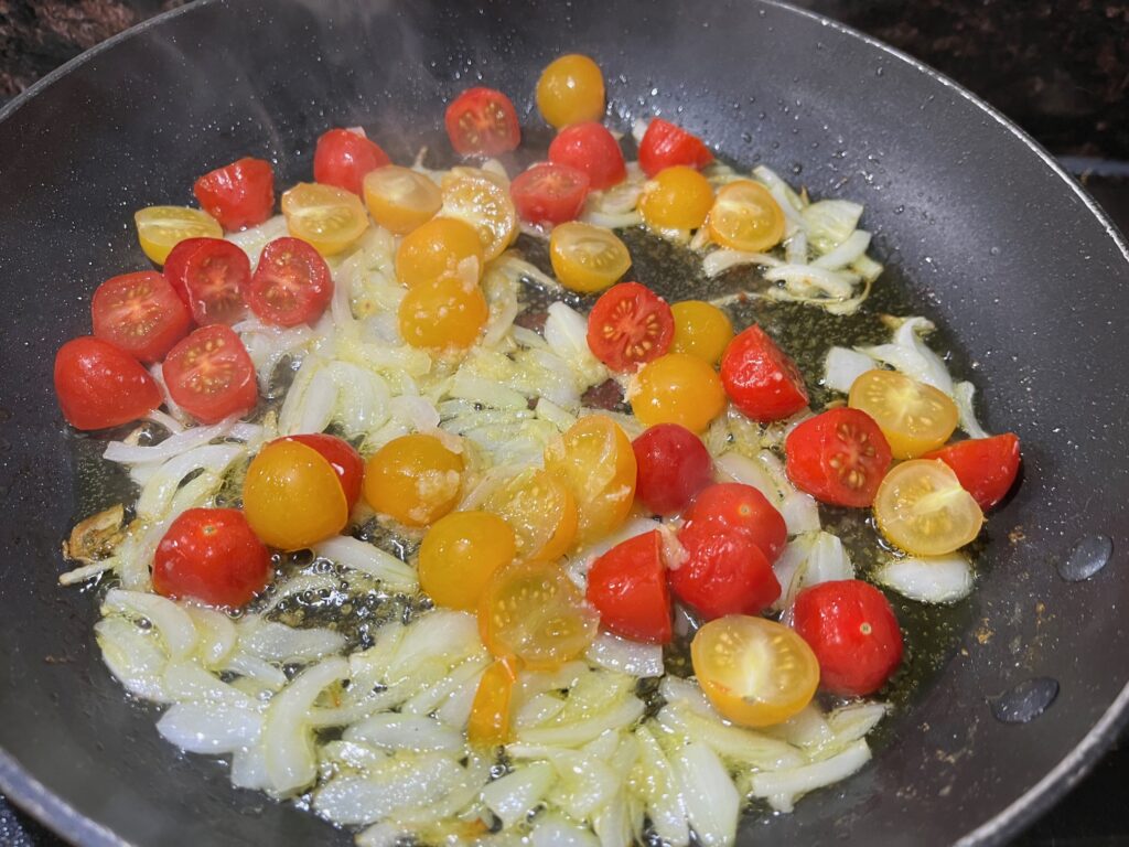 Add the cherry tomatoes to the skillet and cook until they start to soften and burst.