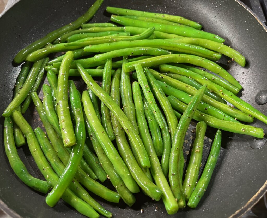 Add the green beans to the skillet and stir fry for 5–7 minutes until they are tender but still crisp.
